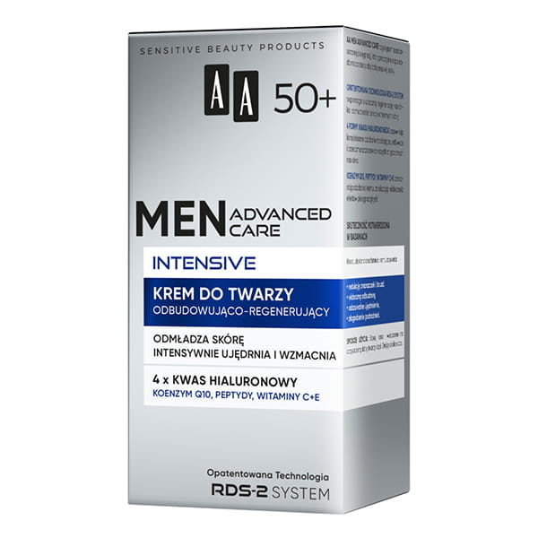 AA Men Advanced Care Intensive 50+ to krem zaprojektowany specjalnie dla dojrzałej skóry męskiej - wspiera regenerację naskórka, poprawia elastyczność i redukuje widoczność zmarszczek, jednocześnie łagodząc podrażnienia i przywracając komfort. Produkt działa wielopoziomowo: nawilża, ujędrnia i wzmacnia barierę ochronną skóry, co przekłada się na zdrowszy, bardziej wypoczęty wygląd.