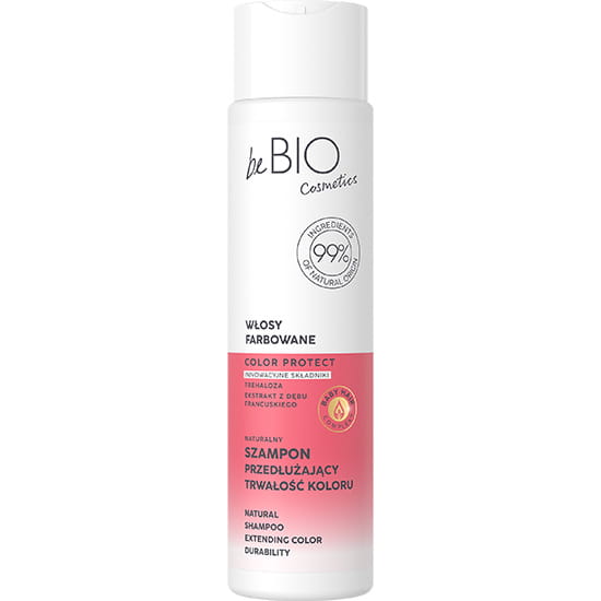 Szampon do włosów farbowanych przedłużający trwałość koloru, który zawiera 99,3% składników pochodzenia naturalnego. Włosy stają się lśniące, wygładzone i zregenerowane. Wpływa również doskonale na ich nawilżenie i odżywienie - Bebio Cosmetics.