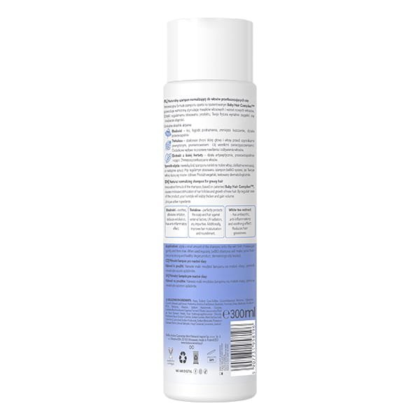Naturalny szampon normalizujący do włosów przetłuszczających się. Zmniejsza łuszczenie, działa przeciwzapalnie. Stymuluje również mieszki włosowe i pobudza wzrost nowych włosów - Bebio Cosmetics.