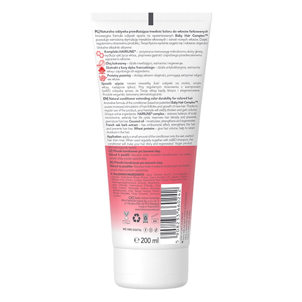 Sposób użycia: nanieś niewielką ilość odżywki na mokre, umyte włosy, następnie spłucz. Przy regularnym stosowaniu z szamponem przedłużającym trwałość koloru do włosów farbowanych beBIO Cosmetics odżywka sprawi, że twoje włosy będą lśniące i zregenerowane.