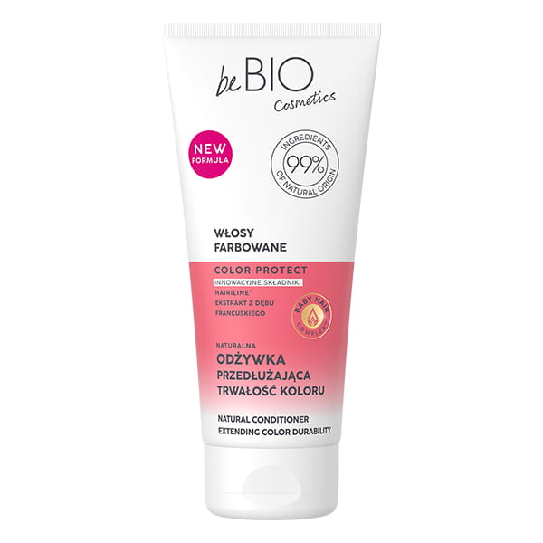 Naturalna odżywka do włosów farbowanych przedłużająca trwałość koloru zawiera 99% składników pochodzenia naturalnego. Włosy stają się lśniące, wygładzone i zregenerowane. Wpływa również doskonale na ich nawilżenie i odżywienie - Bebio Cosmetics.