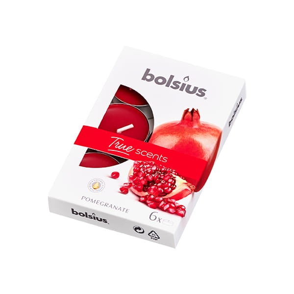 Podgrzewacze o zapachu owoców granatu to kompozycja naturalnych olejków eterycznych. Dzięki standardowym wymiarom mogą rozświetlać ozdobne lampiony i świeczniki - Bolsius True Scents Pomegranate.