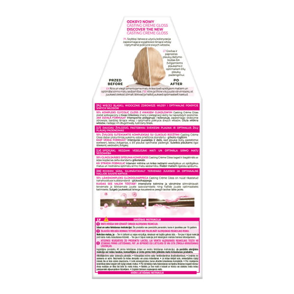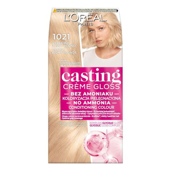 Koloryzacja pielęgnacyjna bez amoniaku, kremowa formuła optymalnie pokrywa siwe włosy utrzymuje się na włosach do 28 myć - L'Oréal Paris Casting Créme Gloss 1021 Jasny Perłowy Blond.