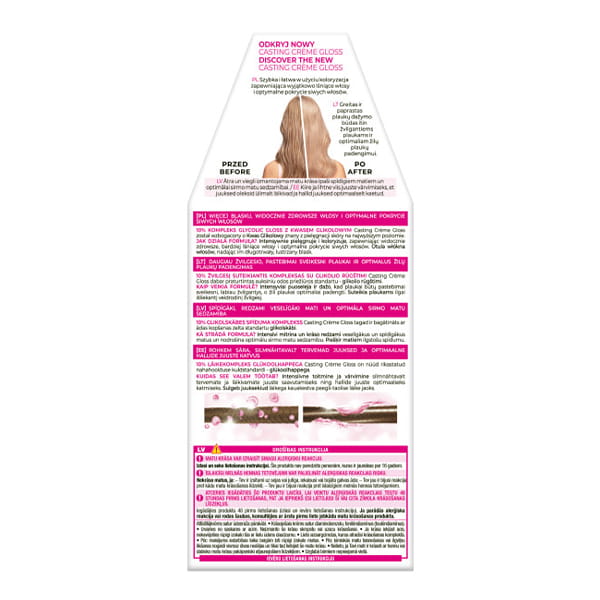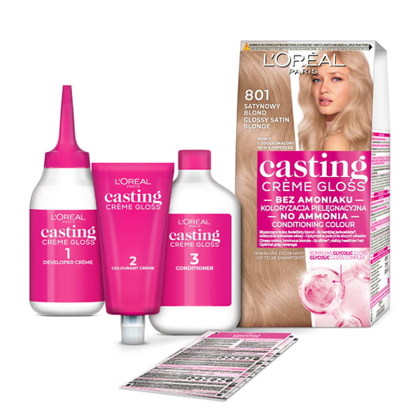 Koloryzacja pielęgnacyjna bez amoniaku, kremowa formuła optymalnie pokrywa siwe włosy utrzymuje się na włosach do 28 myć - L'Oréal Paris Casting Créme Gloss 801 Satynowy Blond.