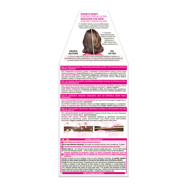 Koloryzacja pielęgnacyjna bez amoniaku, kremowa formuła optymalnie pokrywa siwe włosy utrzymuje się na włosach do 28 myć - L'Oréal Paris Casting Créme Gloss 613 Mroźne Mochaccino.