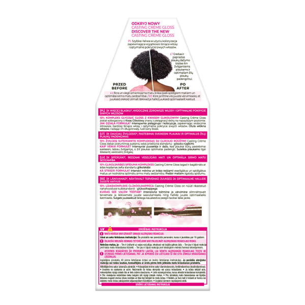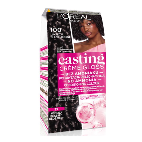 Koloryzacja pielęgnacyjna bez amoniaku, kremowa formuła optymalnie pokrywa siwe włosy utrzymuje się na włosach do 28 myć - L'Oréal Paris Casting Créme Gloss 100 Lukrecja.