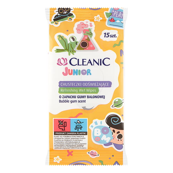 Chusteczki nawilżane, odświeżające Cleanic Junior o zapachu gumy balonowej przeznaczone są do czyszczenia dziecięcych rączek i buzi.