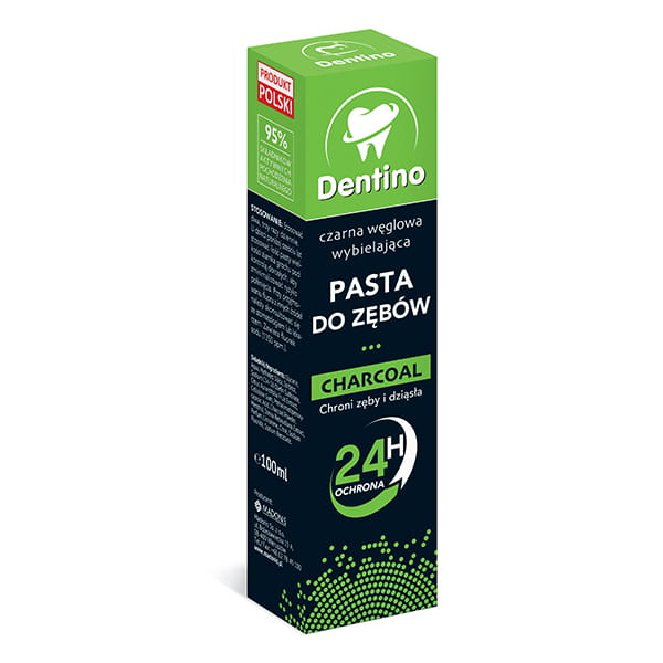 Czarna, węglowa wybielająca pasta do zębów, zapewnia skuteczne oczyszczanie i pielęgnację zębów i dziąseł. Ma łagodny miętowy smak - Dentino.