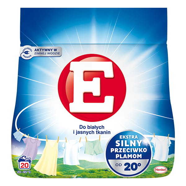 Nowa wzbogacona formuła proszku E do prania tkanin białych i jasnych skutecznie usuwa plamy i zachowuje kolory.