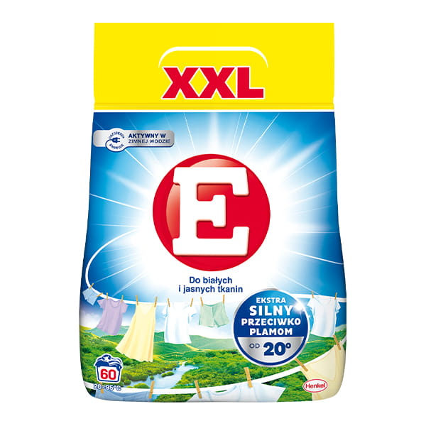 Skuteczny proszek do prania usuwający plamy już od 20°C. Pierz oszczędnie oraz skutecznie - E proszek do prania białych i jasnych tkanin.