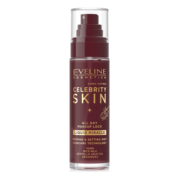 Mgiełka utrwalająco-pielęgnująca do makijażu Liquid Miracle Celebrity Skin utrwala makijaż lekką, niewyczuwalną warstwą, która jednocześnie pielęgnuje skórę i nadaje jej zdrowy blask - Eveline Celebrity Skin.