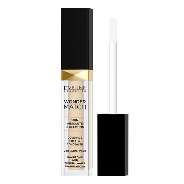 Eveline Wonder Match kremowy, kryjący korektor, który dopasowuje się do odcienia skóry i ma działanie pielęgnujące. Receptura zawiera Kwas hialuronowy oraz wodę termalną, które utrzymują nawilżenie skóry przez cały dzień.