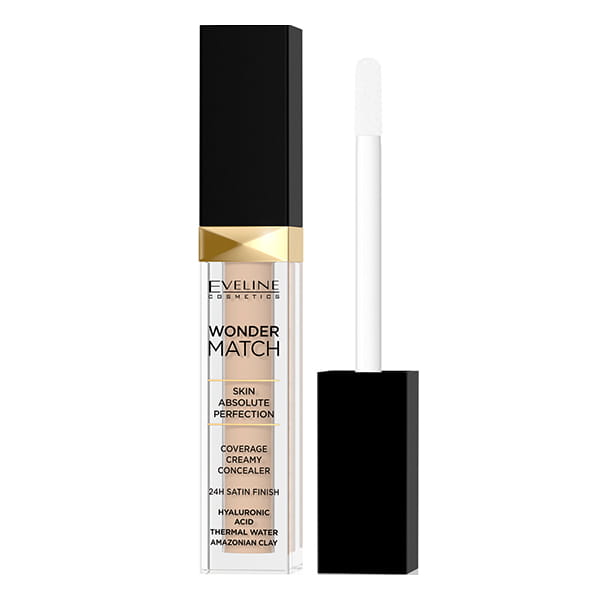 Eveline Wonder Match kremowy, kryjący korektor, który dopasowuje się do odcienia skóry i ma działanie pielęgnujące. Receptura zawiera Kwas hialuronowy oraz wodę termalną, które utrzymują nawilżenie skóry przez cały dzień.