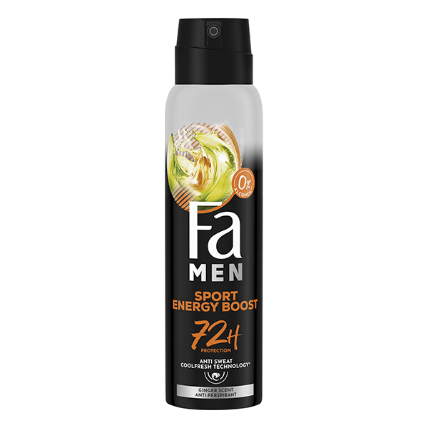 Poznaj nową odsłonę fascynującej świeżości! Wybierz antyperspirant dla mężczyzn w sprayu Fa Sport Energy Boost o odświeżającym i pobudzającym zapachu imbiru i cytryny, który zapewni Ci niezawodną i długotrwałą ochronę do 3 dni. Odśwież swoje ciało & umysł i pozwól swoim zmysłom odkrywać nowe zakątki świata każdego dnia.