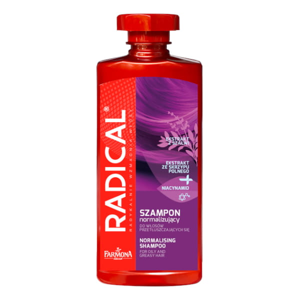 Szampon gwarantuje potrójną siłę działania: wyraźnie wzmacnia włosy, przywraca naturalną równowagę skóry głowy oraz znacząco zmniejsza przetłuszczanie się włosów - Farmona Radical.