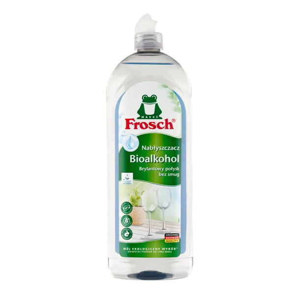 Frosch nabłyszczacz do zmywarki na bazie bioalkoholu. Formuła na bazie bioalkoholu naturalnie ulega całkowitemu spłukaniu u nie pozostawia zabrudzeń, a szybkie wysychanie zapewnia lśniący blask naczyń.