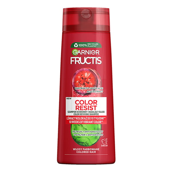 Rewitalizujący szampon Fructis Color Resist zapewnia lśniący kolor aż do 10 tygodni.