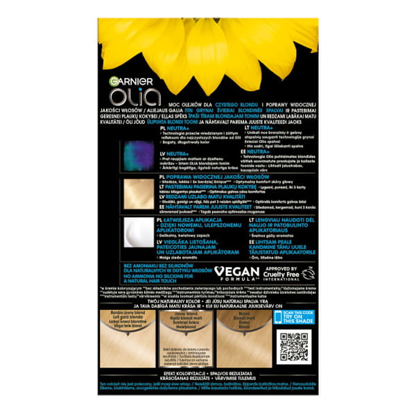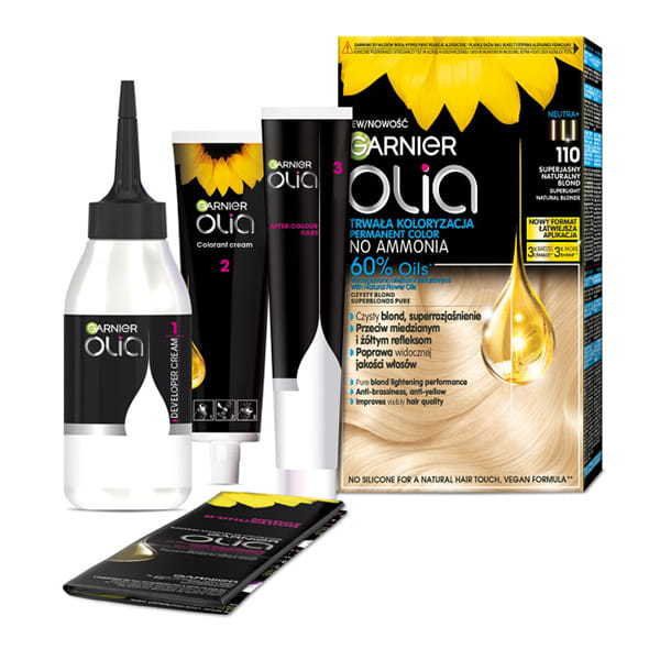 Trwała farba do włosów, bez amoniaku przeciw miedzianym i żółtym refleksom doskonale pokrywa siwe włosy, wzbogacona olejkami kwiatowymi wprowadza intensywny, równomierny i długotrwały kolor do wnętrza włosa, zapewniając widoczną poprawę jakości włosów - Garnier Olia 110 superjasny naturalny blond.