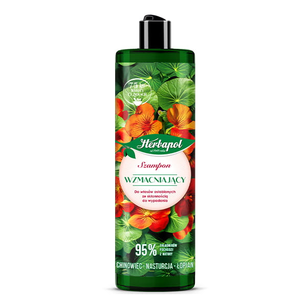 Szampon do włosów osłabionych ze skłonnościom do wypadania. Zawiera fitoskładniki z nasturcji, łopianu i chinowca które chronią włosy przed wypadaniem i dodają objętości - Herbapol Polana.