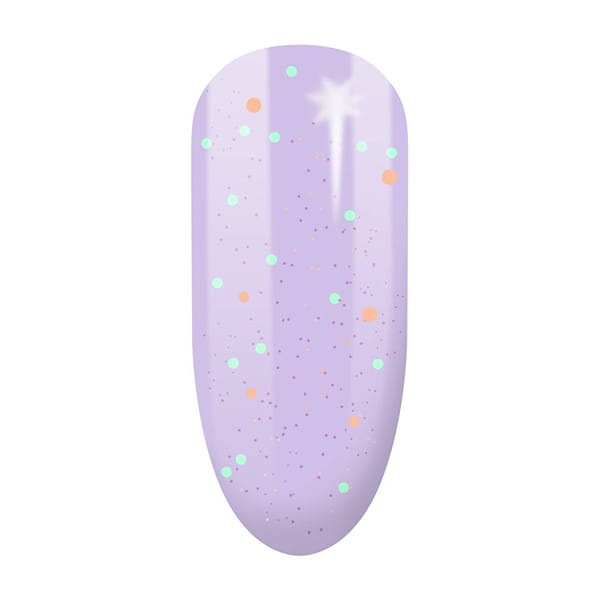 Co powiecie na apetyczny odcień inspirowany kolorem mleczno-jagodowego koktajlu? Delikatnie rozbielony fiolet z pomarańczowymi, limonkowymi i fioletowymi piegami to idealny pomysł na wiosenny jak i wakacyjny manicure. Wygląda pysznie na całej płytce paznokcia, dodaje też charakteru wykorzystany jako element zdobień.