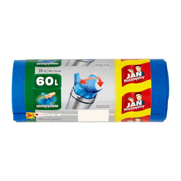 Niebieskie worki na śmieci o pojemności 60l wykonane są z wyjątkowo trwałej i wytrzymałej folii. System Easy Pack gwarantuje łatwe i wygodne zawiązywanie worków - Jan Niezbędny Easy Pack.