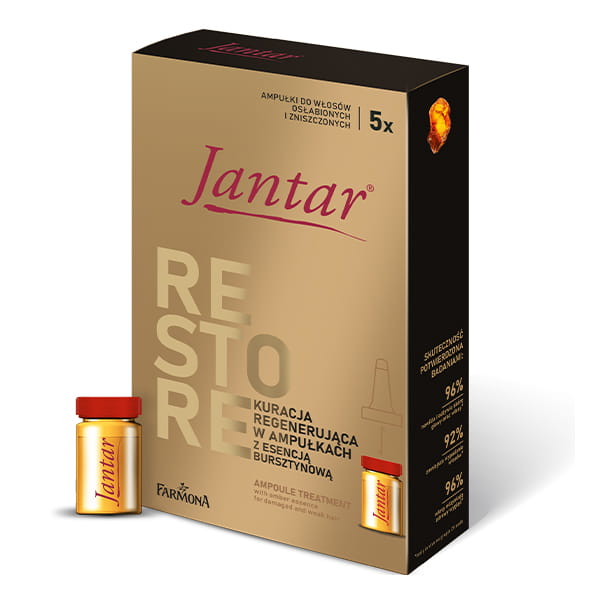 Kuracja w ampułkach z esencją bursztynową do włosów bardzo zniszczonych i osłabionych. Glukoza oraz witaminy nawilżają, intensywnie odżywiają i wzmacniają włosy, proteiny nadają miękkość i elastyczność - Jantar Restore.