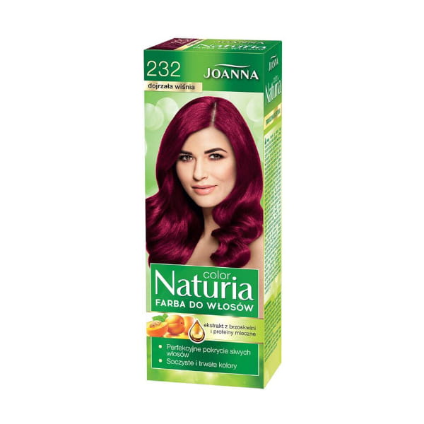 Trwała farba do włosów zapewniająca atrakcyjny i głęboki odcień oraz perfekcyjne pokrycie siwych włosów - Joanna Naturia Color Dojrzała Wiśnia 232.