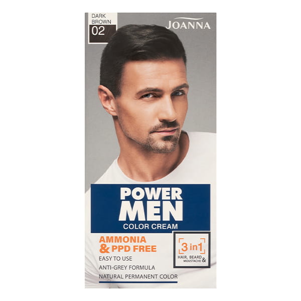 Farba dla mężczyzn do trwałego pokrycia siwych włosów, aby uzyskać naturalny kolor bez siwych włosów - Joanna Power Men Color Cream Farba 02 Dark Brown.