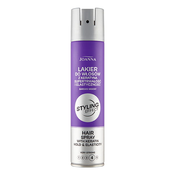 Lakier do włosów doskonale utrwala fryzurę, a dzięki keratynie wzmacnia włosy - Joanna Styling Effect.