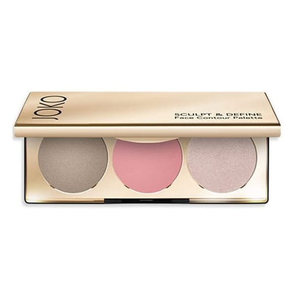 Profesjonalna paleta do konturowania, zawierająca róż, bronzer i rozświetlacz - idealna do codziennego makijażu i szybkich poprawek - Joko Sculpt&Define.