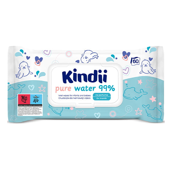 Chusteczki nawilżane dla dzieci Kindii Pure Water 99% zostały stworzone z myślą o wrażliwej skórze niemowląt i dzieci.