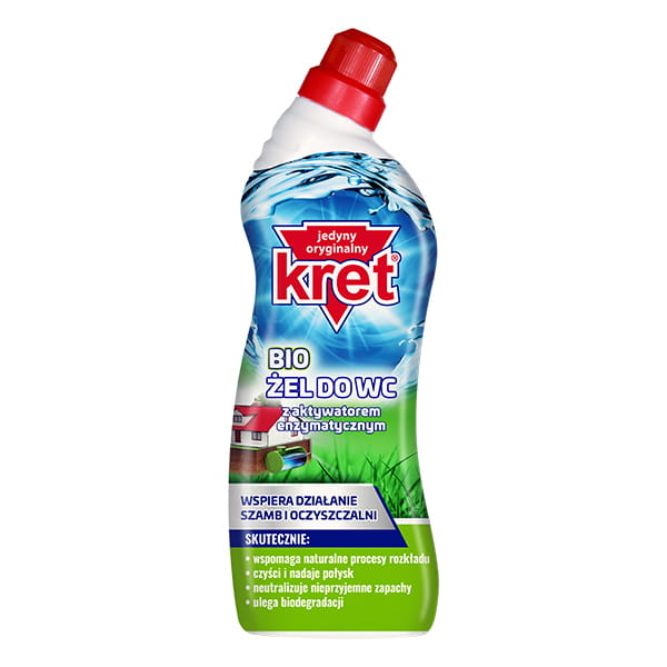 Żel do wc z aktywatorem enzymatycznym, skutecznie czyści muszle, pisuary, bidety, a także rury kanalizacyjne. Zapobiega osadzaniu się zanieczyszczeń, tworzeniu kamienia oraz neutralizuje nieprzyjemne zapachy - Kret bio żel.