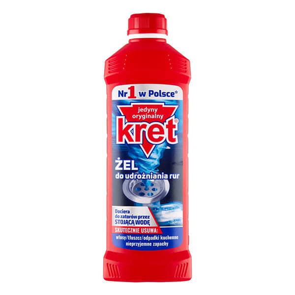 Nowoczesny środek do chemicznego udrożniania rur i syfonów w instalacjach kanalizacyjnych, który samoczynnie usuwa wszelkie zanieczyszczenia stałe i organiczne - Kret Żel.