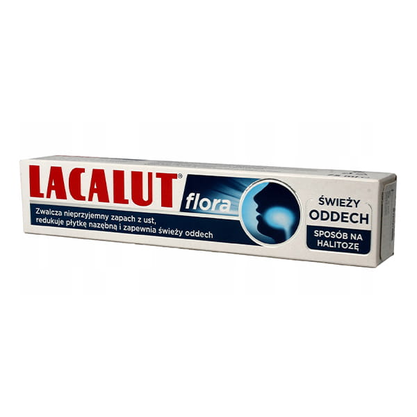 Specjalistyczna pasta do zębów nadająca świeży oddech. Zwalcza nieprzyjemny zapach z ust oraz redukuje płytkę nazębną - Lacalut Flora.