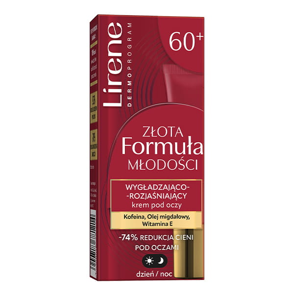 Lirene Złota Formuła Młodości to wygładzająco‑rozjaśniający krem pod oczy, który redukuje cienie, wygładza zmarszczki i dodaje spojrzeniu blasku. Skóra pod oczami jest cienka, delikatna i szybko zdradza oznaki zmęczenia. Lirene Złota Formuła Młodości została stworzona po to, aby przywrócić jej gładkość, promienność i młodzieńczy wygląd. Krem działa wielokierunkowo: rozjaśnia cienie, wygładza drobne zmarszczki, nawilża i poprawia elastyczność, dzięki czemu spojrzenie staje się wyraźnie odświeżone.