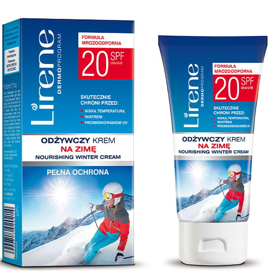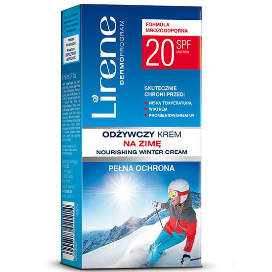 Odżywczy krem, który skutecznie chroni przed wiatrem i niską temperaturą oraz promieniowaniem UV. Przeznaczony dla każdego rodzaju skóry. Łagodzi zaczerwienienia oraz podrażnienia wywołane zimnem. Nawilża, odżywia i chroni przed szkodliwym promieniowaniem słonecznym - Lirene.