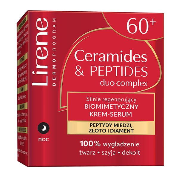 Lirene Ceramides & Peptides Duo Complex silnie regenerujący biomimetyczny krem-serum na noc 60+, który intensywnie regeneruje, wygładza zmarszczki i poprawia jędrność skóry w trakcie snu. To zaawansowana nocna kuracja, która działa wtedy, gdy skóra regeneruje się najintensywniej. Biomimetyczna formuła kremu‑serum została opracowana tak, aby naśladować naturalne procesy naprawcze skóry, dzięki czemu efekty są widoczne szybciej i trwają dłużej.