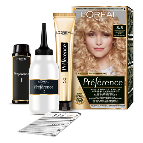 Farba do włosów zapewniająca długotrwały, intensywny kolor i zachowująca połysk aż do 8 tygodni, doskonałe pokrywa siwe włosy - L'Oréal Paris Preference X8.3 Jasny Złocisty Blond.