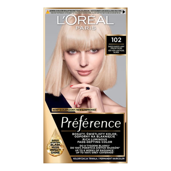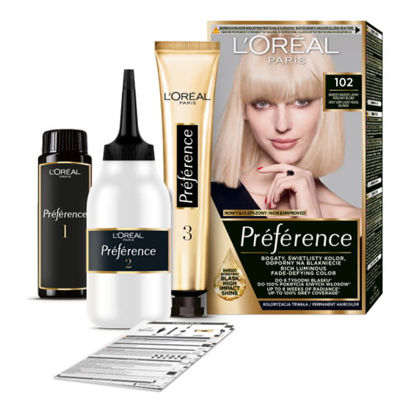 Farba do włosów zapewnijąca długotrwały, intensywny kolor i zachowująca połysk aż do 8 tygodni, doskonałe pokrywa siwe włosy - L'Oréal Paris Preference 102 Bardzo Jasny Blond Perłowy.