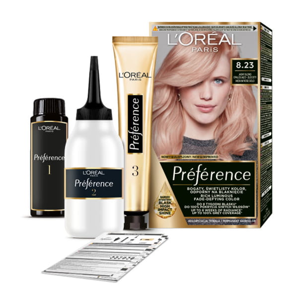 Farba do włosów zapewniająca długotrwały, intensywny kolor i zachowująca połysk aż do 8 tygodni, doskonałe pokrywa siwe włosy - L'Oréal Paris Preference 8.23 Medium Rose Gold.
