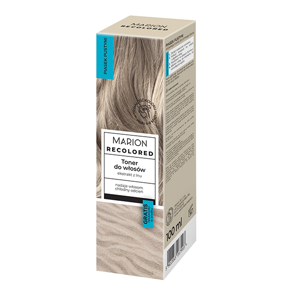 Marion Recolored Toner Piasek Pustyni to półtrwały toner do włosów, który neutralizuje ciepłe tony i nadaje chłodny, stonowany odcień blondu, jednocześnie pielęgnując włosy dzięki formule bez amoniaku. Produkt zapewnia szybkie odświeżenie koloru i widoczny połysk.