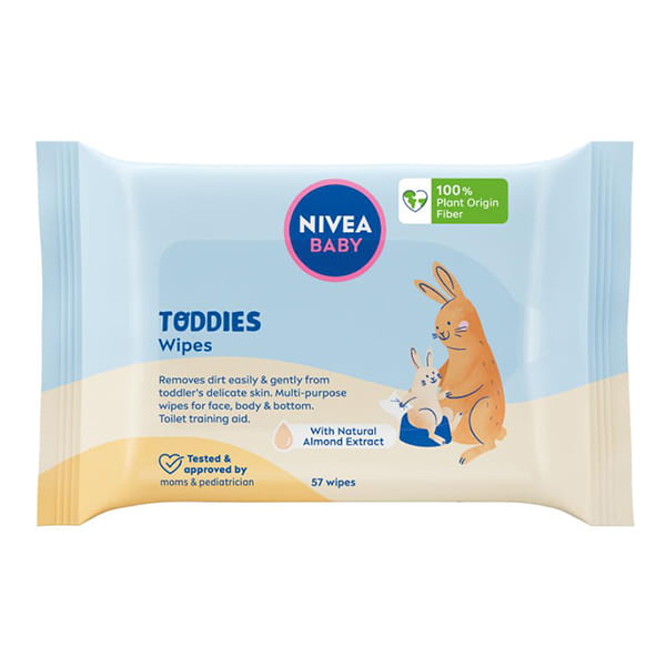 Nivea Baby Toddies chusteczki biodegradowalne o wielofunkcyjnym zastosowaniu zaprojektowane tak, aby wspomóc proces nauki samodzielnego korzystania z toalety lub nocnika.