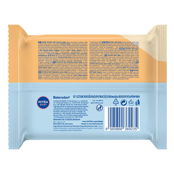 Toddies chusteczki biodegradowalne o wielofunkcyjnym zastosowaniu skutecznie, ale łagodnie oczyszczają buzię, rączki i okolice okołopieluszkowe dziecka - Nivea Baby.