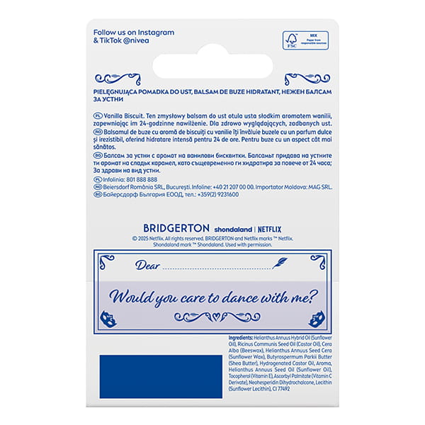 Pielęgnująca pomadka NIVEA Bridgerton Vanilla Biscuit to limitowana edycja inspirowana postaciami Sophie i Benedict.