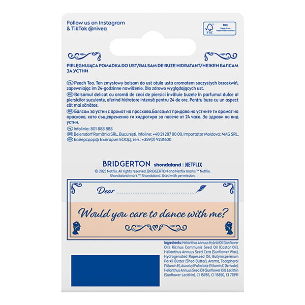 Intensywnie nawilżająca pomadka z delikatnym aromatem brzoskwini, zapewnia miękkość i subtelny połysk - Nivea Bridgerton Edition.