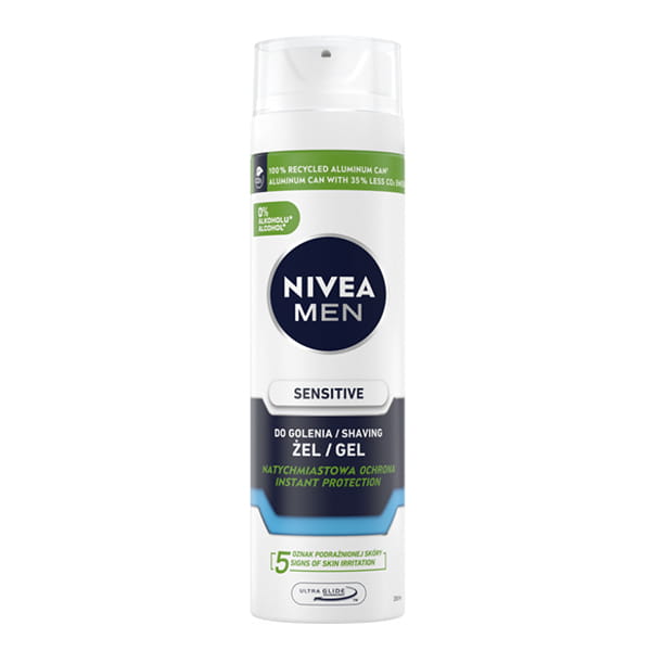 Nivea Men łagodzący żel do golenia Sensitive chroni wrażliwą skórę twarzy przed podrażnieniami. Bezalkoholowa formuła z rumiankiem i witaminą E natychmiast chroni przed 5 oznakami podrażnionej goleniem skóry: pieczeniem, zaczerwienieniem, uczuciem napiętej i suchej skóry oraz mikro-zacięciami.