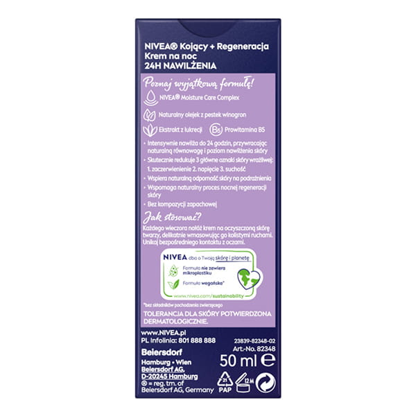 Kojąco‑regenerujący krem na noc z olejkiem z pestek winogron, ekstraktem z lukrecji i prowitaminą B5, który ntensywnie nawilża, łagodzi i wspiera nocną regenerację skóry - Nivea Kojąco-regenerujący krem na noc 24H Nawilżenia.