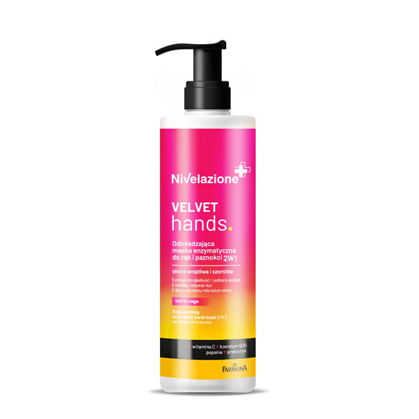 Innowacyjna formuła 2w1 i bogaty skład, dzięki połączeniu enzymatycznego peelingu i wygładzającej maski gwarantuje spektakularne efekty w krótkim czasie - Nivelazione Velvet Hands.