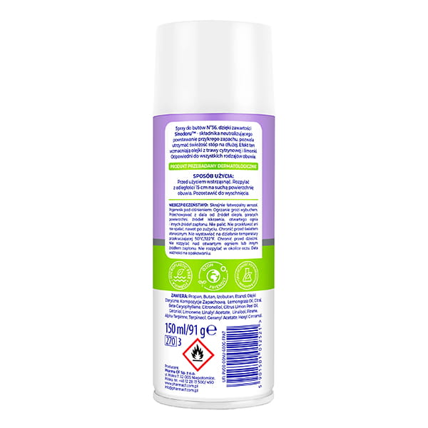 Spray do butów NO - 36 zawiera komplex antifungi , który działa antyseptycznie i dezynfekująco, eliminując nadmierne pocenie oraz nieprzyjemny zapach.