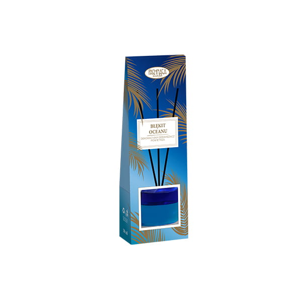 Dekoracyjny Odświeżacz Powietrza Błękit Oceanu to elegancki flakonik z esencją zapachową. Postaw go w salonie, łazience, sypialni, gabinecie lub biurze i ciesz się intensywnym zapachem.